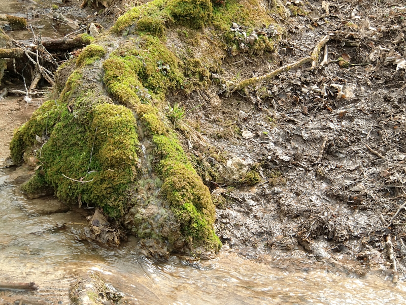 an einer Schichtquelle austreten und an einem relativ sanften Hang abfließen können. Wenn die Kalkausfällung anhält, können steinerne Rinnen